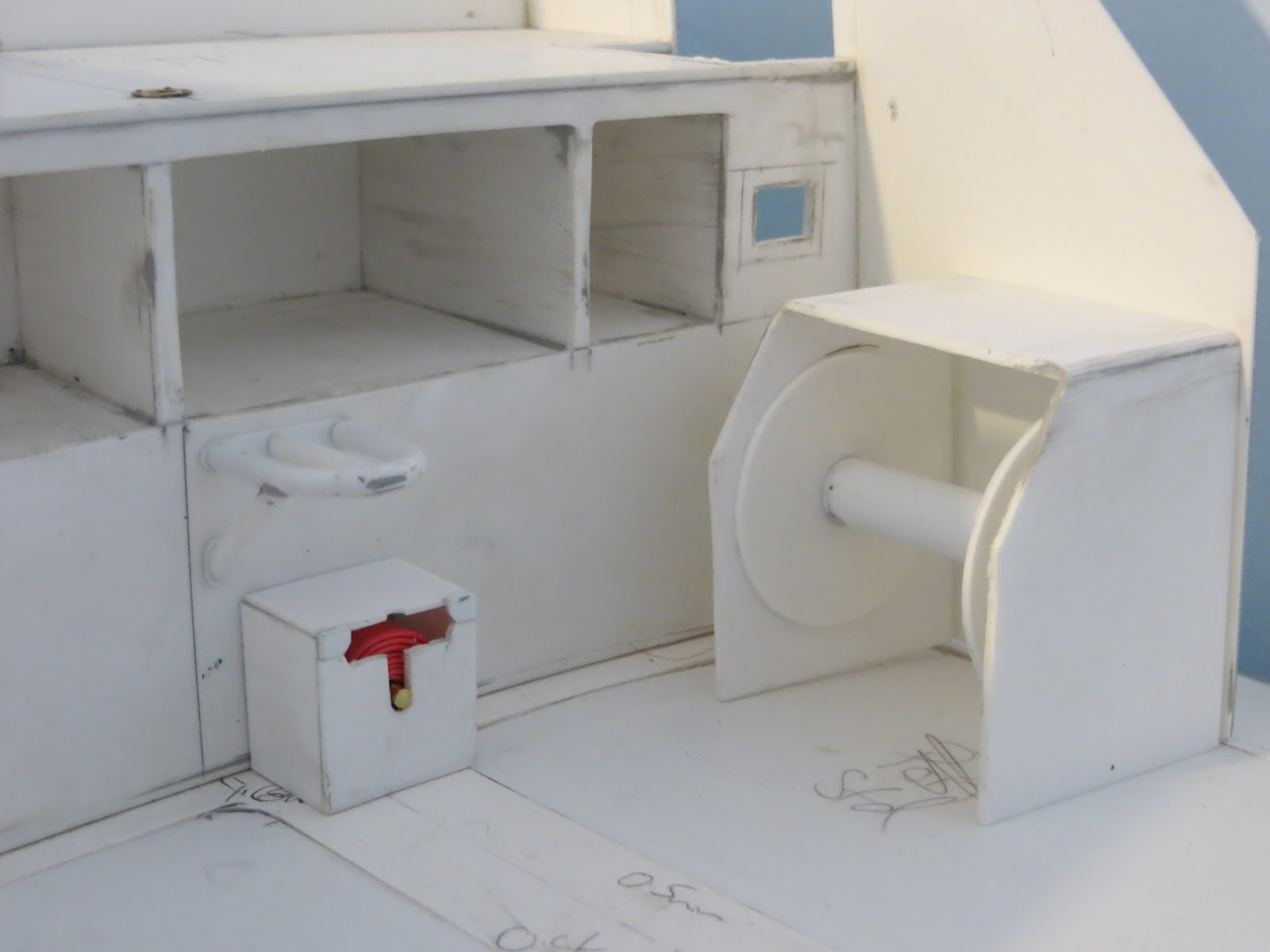 This time, I've been working on the back of the wheelhouse, trying to finish of the various storage boxes and vent housings that I'd started ages ago. Some of the boxes have warped slightly so I added squares aof styrene inside to sqaure them up.